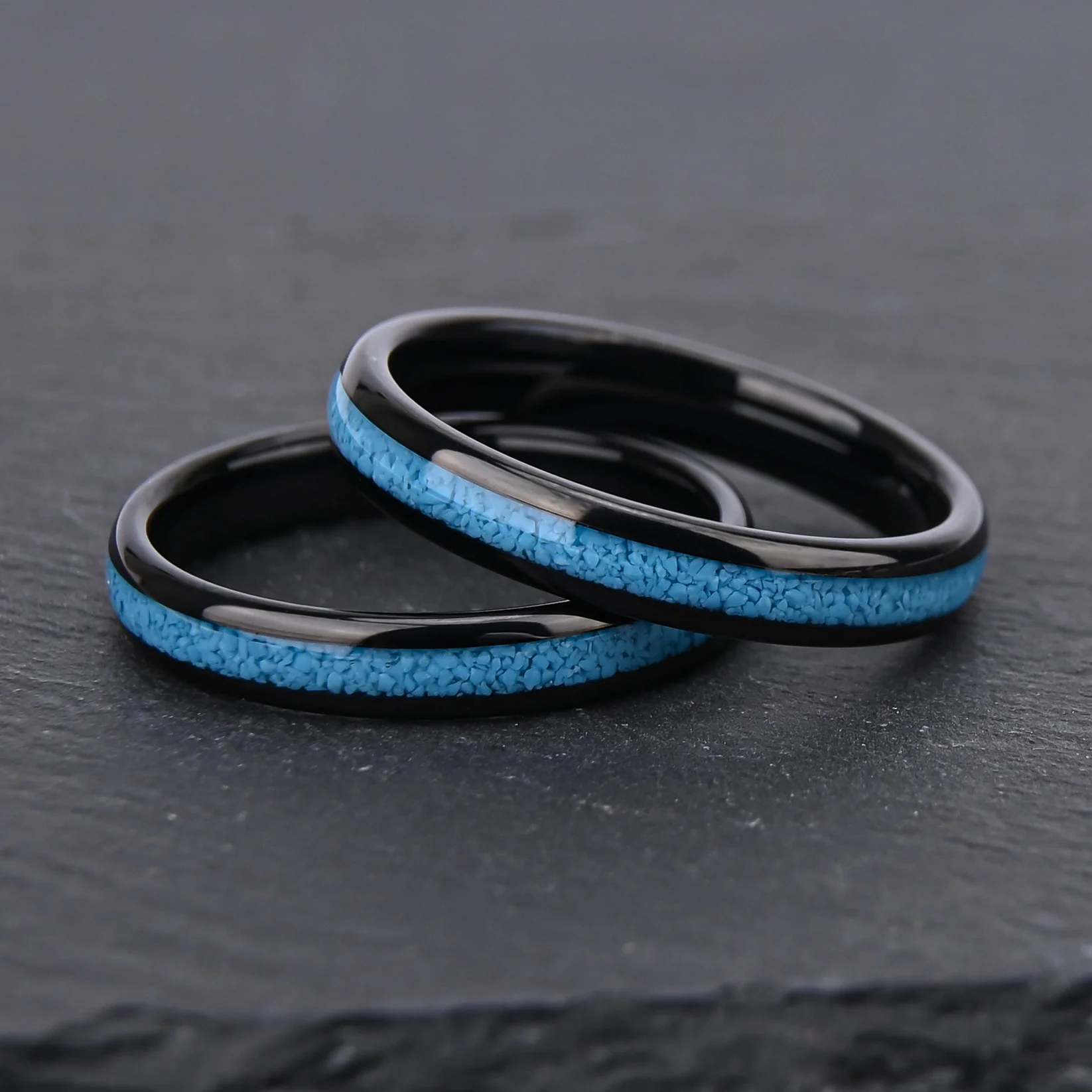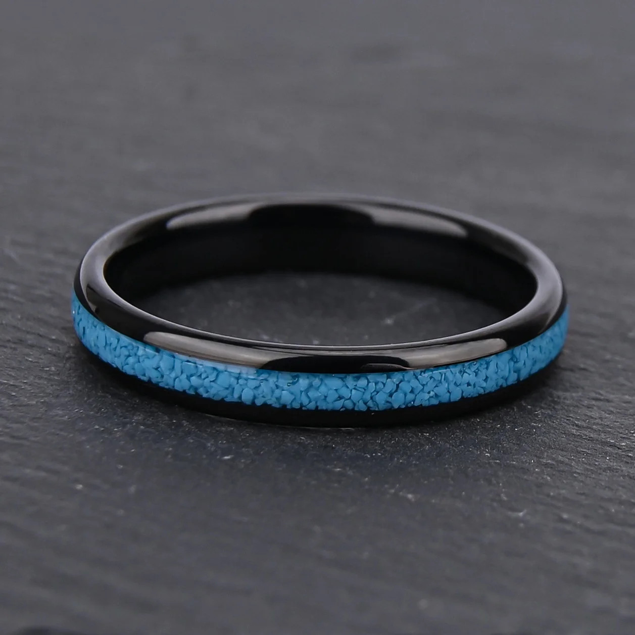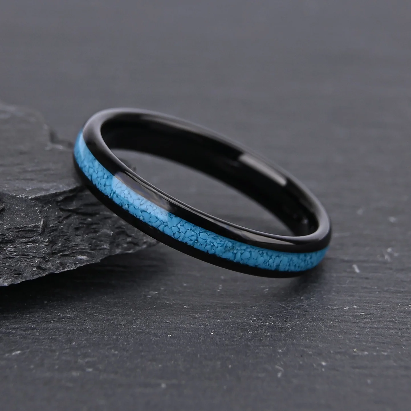 A splash of color against the night. This 4mm Tungsten Carbide ring features a sleek, domed black finish that perfectly frames the vibrant blue of the crushed natural turquoise inlay. Durable and scratch-resistant, it’s a striking choice for a women’s wedding band or a colorful promise ring. (译:暗夜中的一抹亮色。这款 4mm