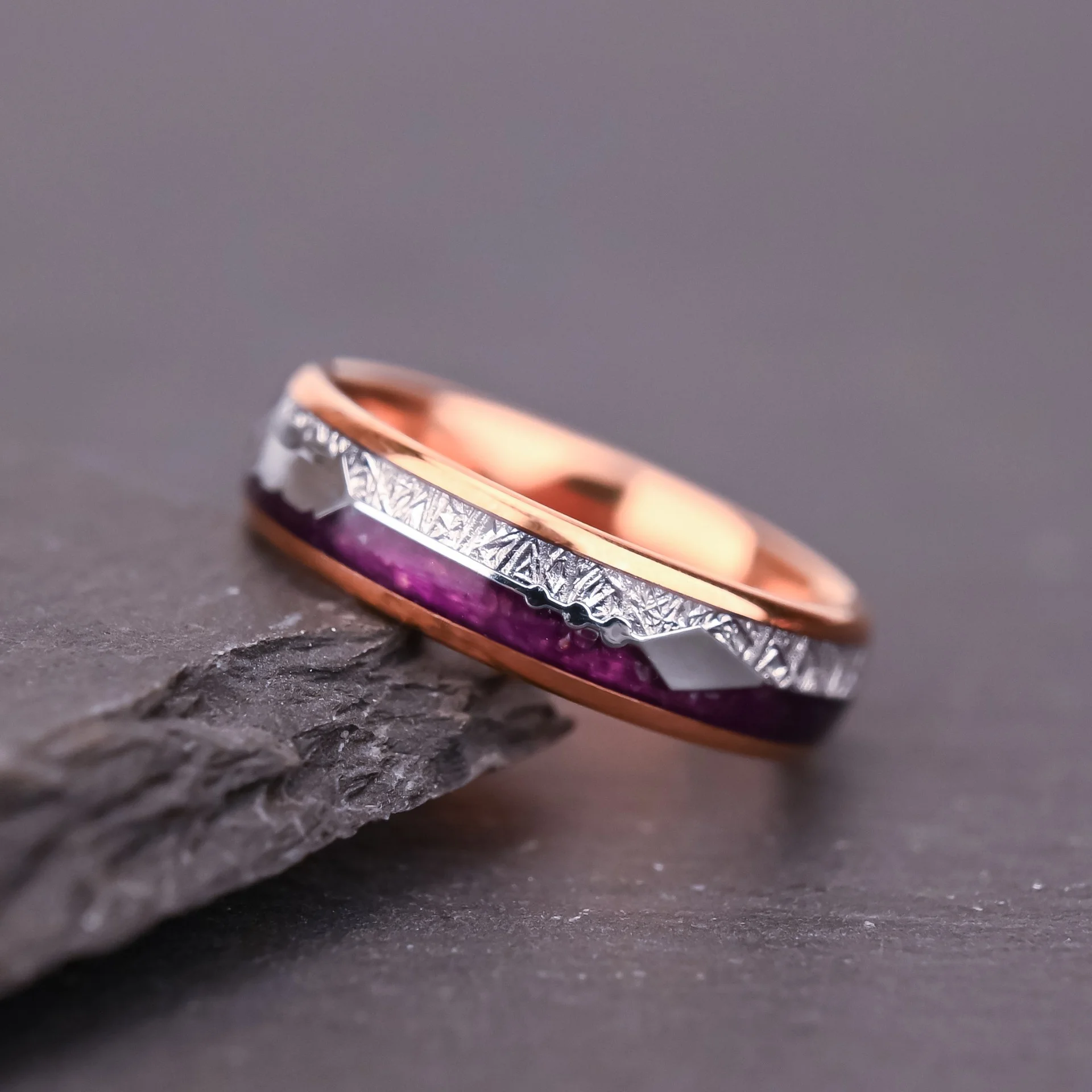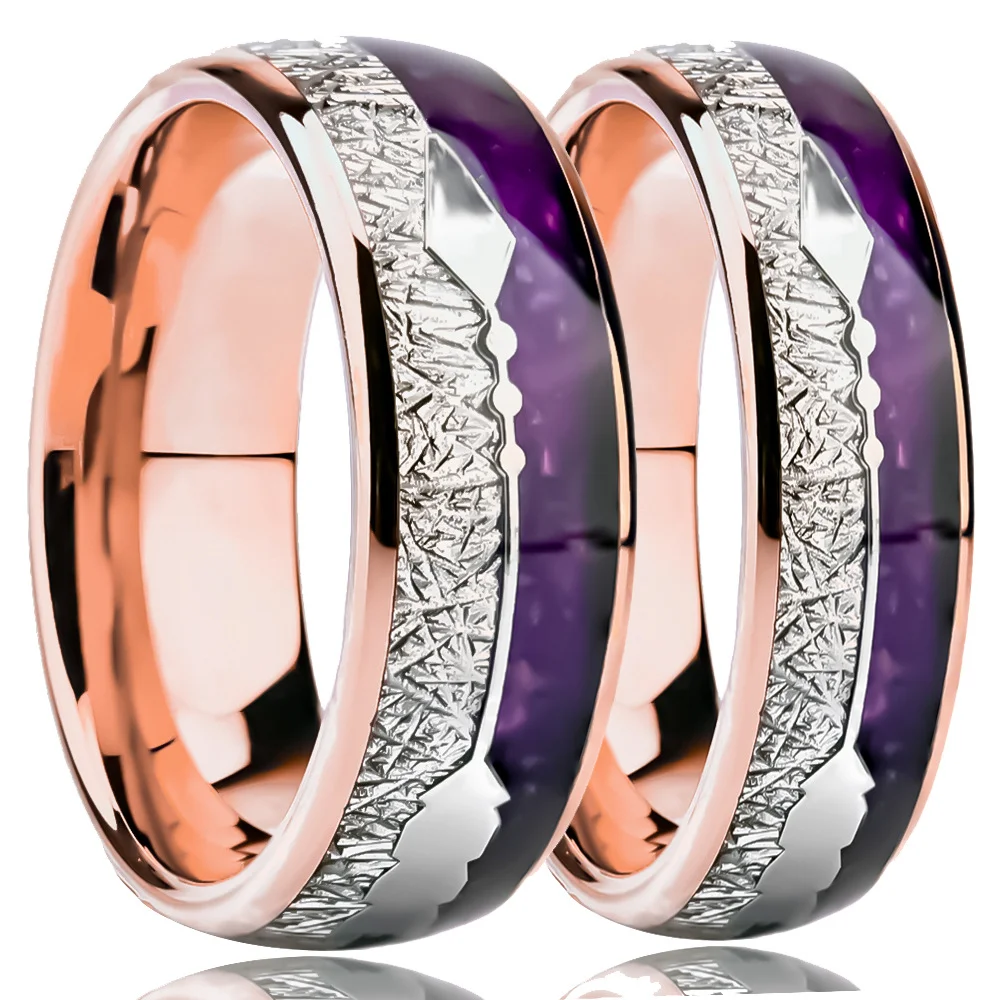 His & Hers Rose Gold Tungsten Rings with Purple Lapis & Meteorite Inlay
