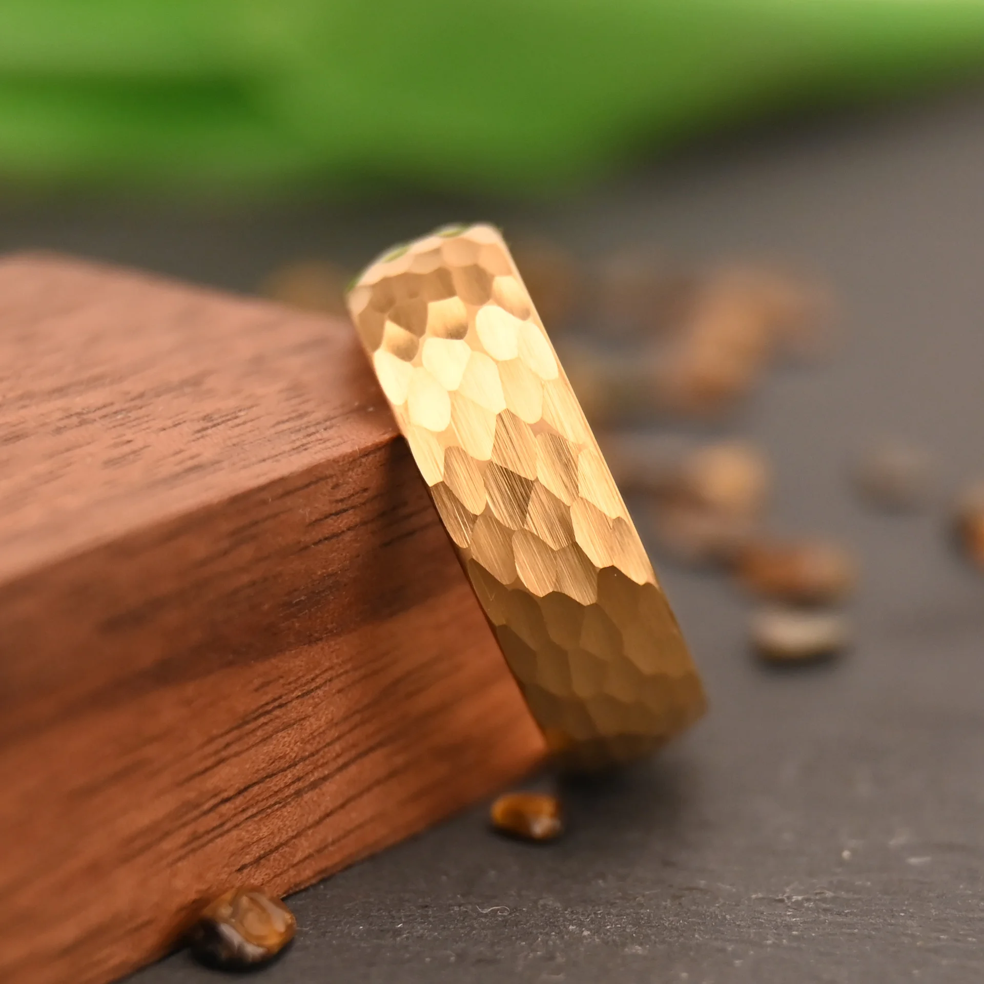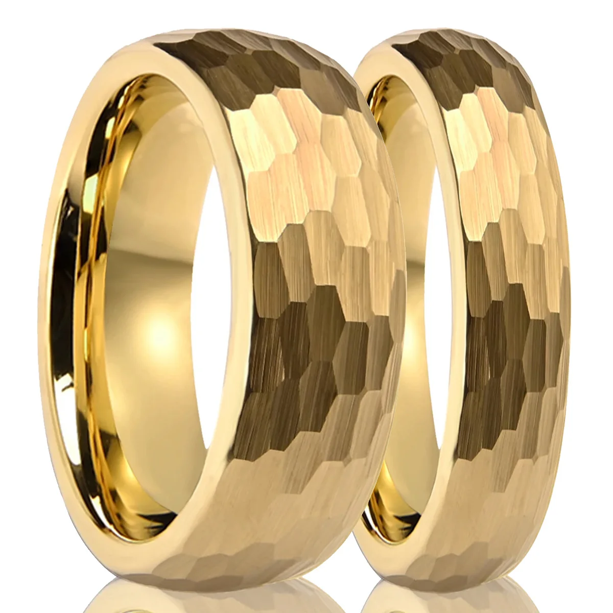 Classic luxury meets modern durability. This 8mm Tungsten Carbide ring features a stunning hand-hammered finish plated in rich 18K gold. The multi-faceted texture catches the light from every angle while masking everyday wear. An affordable yet premium-looking wedding band for men who appreciate artisan craftsmanship.