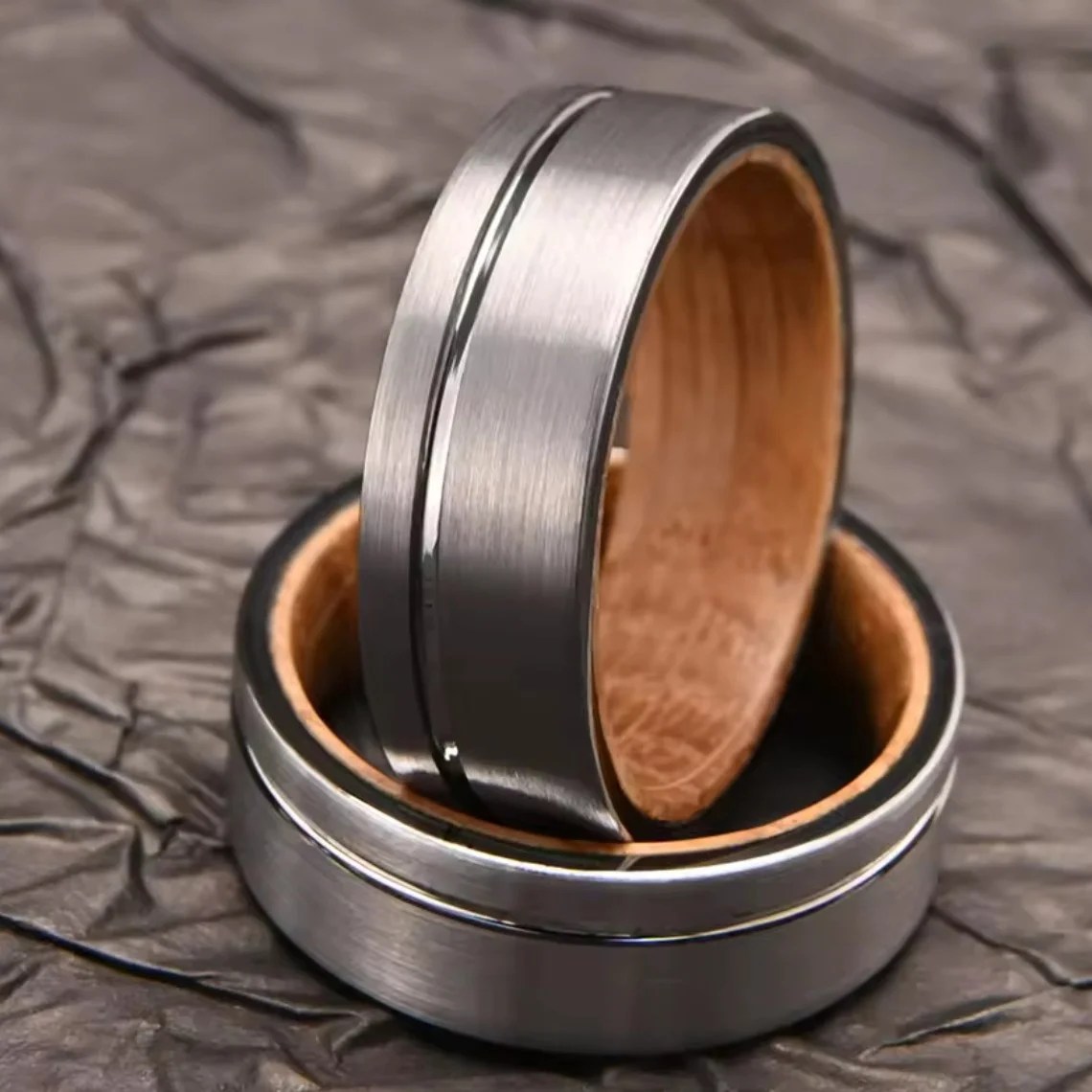 Tough on the outside, natural on the inside. This 8mm Tungsten Carbide ring features a rugged brushed silver finish for maximum scratch resistance, paired with a smooth, genuine Whiskey Barrel Wood sleeve for comfort. The perfect wedding band for men who appreciate the warmth of wood and the strength of metal.